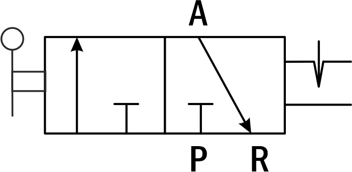 В исходном положении порт питания P перекрыт, рабочий порт А соединен с портом выхлопа R. При повороте рукоятки порт питания Р соединяется с рабочим портом А, а порт выхлопа R перекрывается. При возврате рукоятки в начальное положение золотник также возвращается в исходное положение.